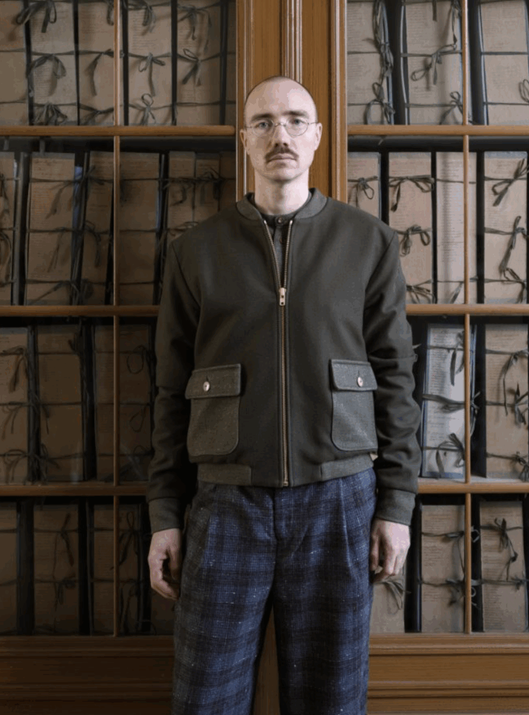 Every collection is a story. One season might reference the lives of miners in the Ruhr Valley, another the atmosphere of a German tavern, another the faded elegance of vintage household fabrics. To wear a Frank Leder jacket is to wear a fragment of cultural history, transformed into modern form. Even the fabrics themselves often carry narrative weight — sourced from traditional mills, deadstock archives, or materials once used for workwear and repurposed into contemporary garments. When I ask Frank where his ideas for a collection come from, he tells me that “it all starts with the fabric.” Then he decides what “ideas” fit, given the fabric he has.